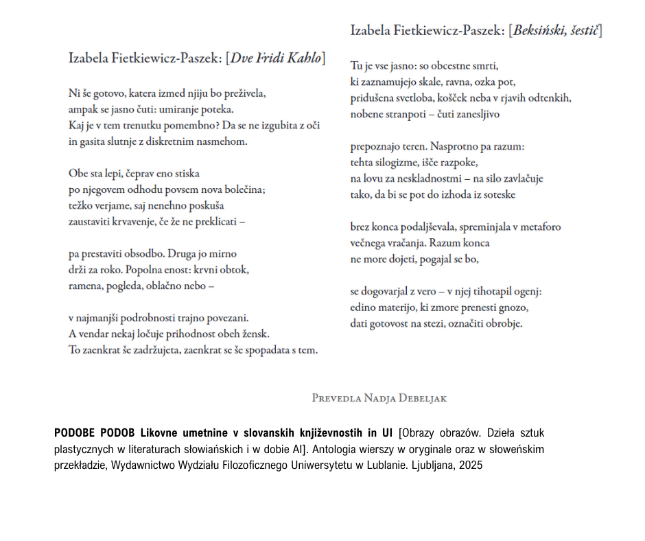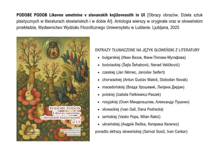 A wszystko w książce pt. „PODOBE PODOB Likovne umetnine v slovanskih književnostih in UI” [Obrazy obrazów. Dzieła sztuk plastycznych w literaturach słowiańskich i w dobie AI], która ukazała się nakładem Wydawnictwa Wydziału Filozoficznego Uniwersytetu w Lublanie. Oprócz papierowej wersji, książka dostępna jest pod tym linkiem.