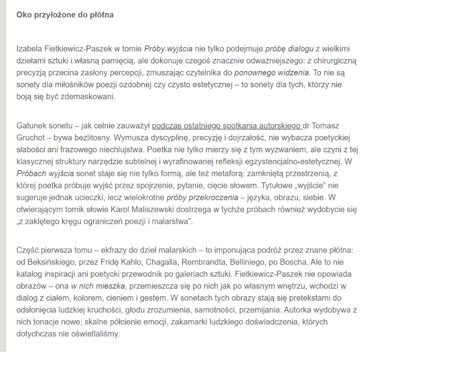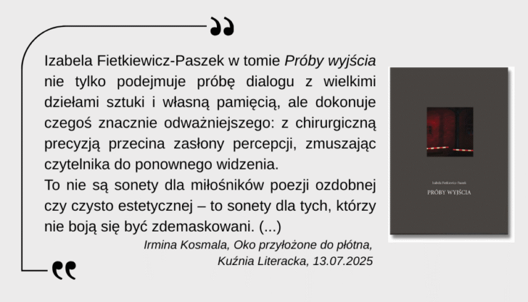 Izabela Fietkiewicz-Paszek w tomie Próby wyjścia nie tylko podejmuje próbę dialogu z wielkimi dziełami sztuki i własną pamięcią, ale dokonuje czegoś znacznie odważniejszego: z chirurgiczną precyzją przecina zasłony percepcji, zmuszając czytelnika do ponownego widzenia. To nie są sonety dla miłośników poezji ozdobnej czy czysto estetycznej – to sonety dla tych, którzy nie boją się być zdemaskowani.