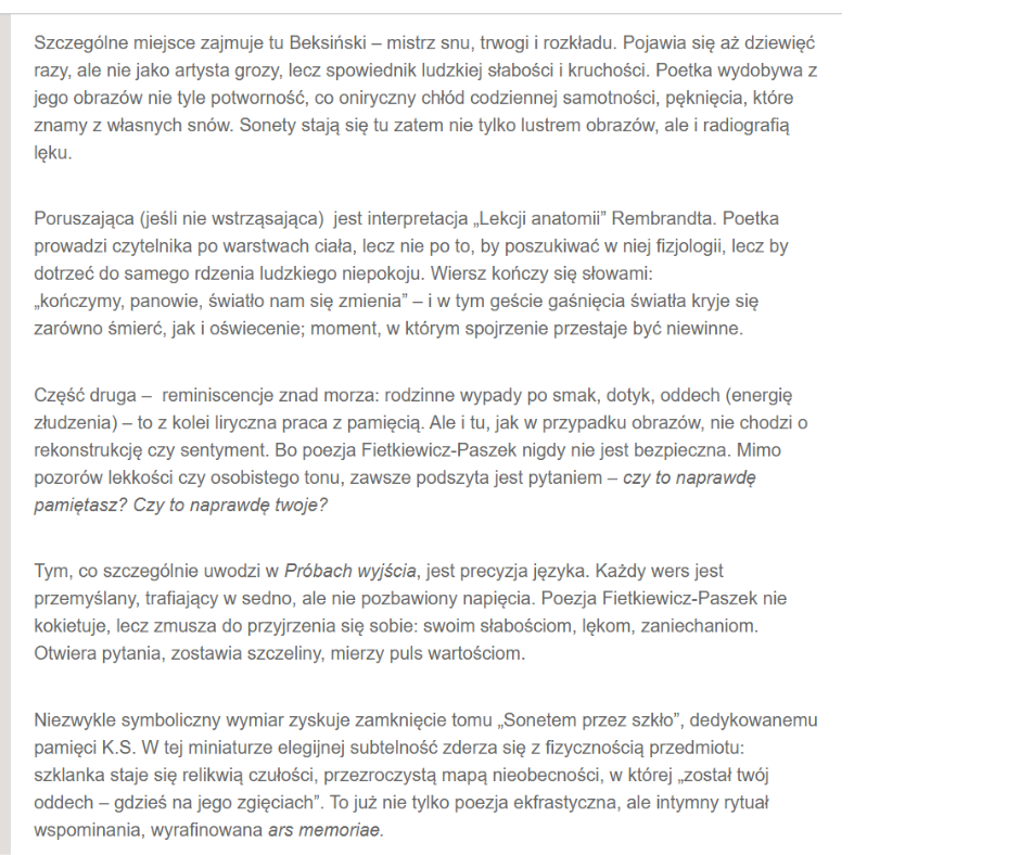 Tym, co szczególnie uwodzi w Próbach wyjścia, jest precyzja języka. Każdy wers jest przemyślany, trafiający w sedno, ale nie pozbawiony napięcia. Poezja Fietkiewicz-Paszek nie kokietuje, lecz zmusza do przyjrzenia się sobie: swoim słabościom, lękom, zaniechaniom. Otwiera pytania, zostawia szczeliny, mierzy puls wartościom.