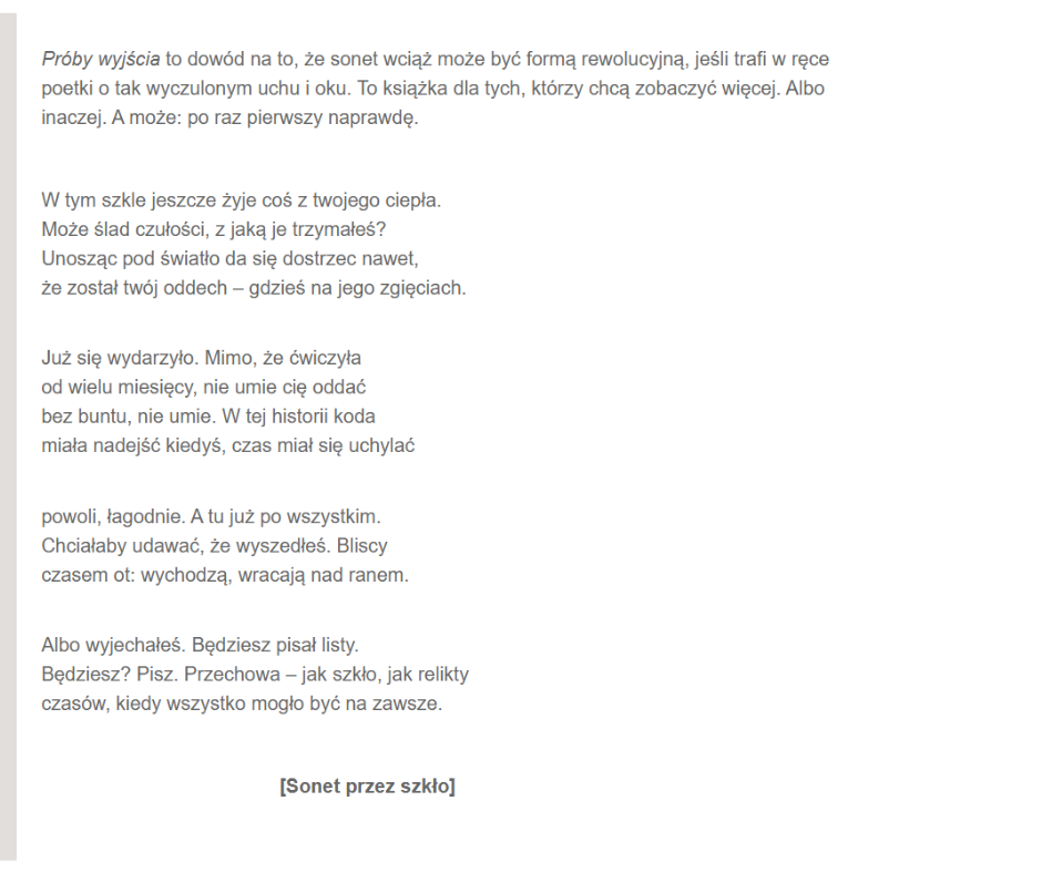 Próby wyjścia to dowód na to, że sonet wciąż może być formą rewolucyjną, jeśli trafi w ręce poetki o tak wyczulonym uchu i oku. To książka dla tych, którzy chcą zobaczyć więcej. Albo inaczej. A może: po raz pierwszy naprawdę.