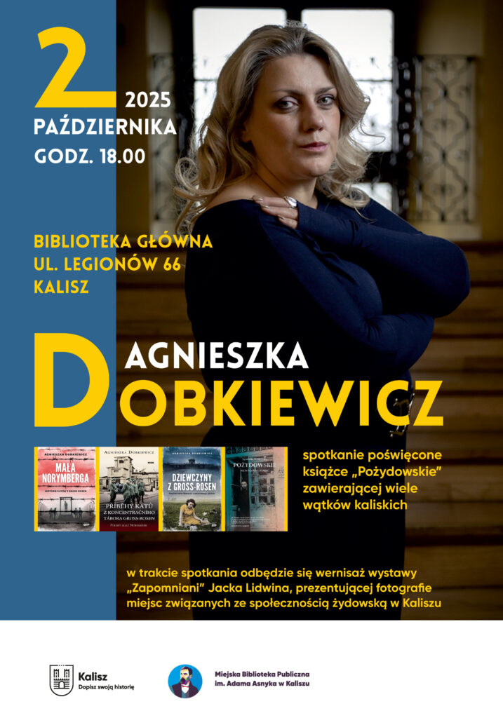 AGNIESZKA DOBKIEWICZ, autorka poruszających reportaży, odwiedzi Bibliotekę w październiku. Spotkanie będzie także okazją do otwarcia wystawy „Zapomniani” JACKA LIDWINA, dokumentującej miejsca związane z kaliską społecznością żydowską i rozmowy z artystą.